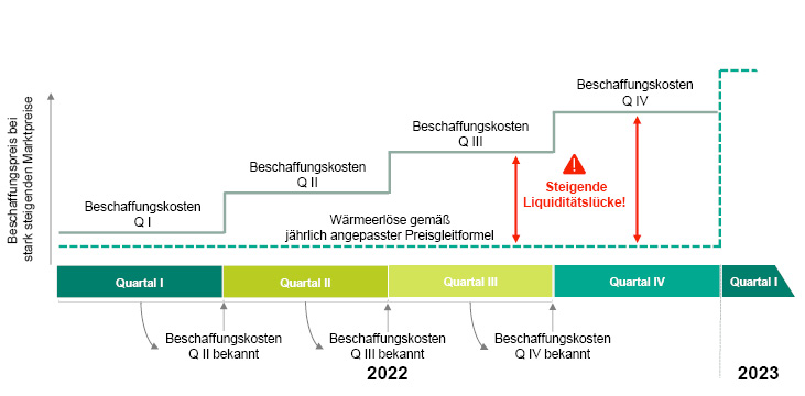 Falls sich durch die aktuelle Entwicklung der Beschaffungskosten bei Wärmeversorgen bei sonst gleicher Erzeugungsstruktur Liquiditätsschwierigkeiten abzeichnen, sollte daher kurzfristig geprüft werden, ob der Anpassungsrhythmus z.B. von jährlich auf quartalsweise angepasst werden kann. Damit können die Einnahmen aus den Kundenabschlägen kurzfristig gesteigert werden. Bei solchen Vorhaben sind allerdings die aktuellen Kundenverträge, das Messkonzept und die Auswirkung auf die Jahresabrechnung im Blick zu behalten.​