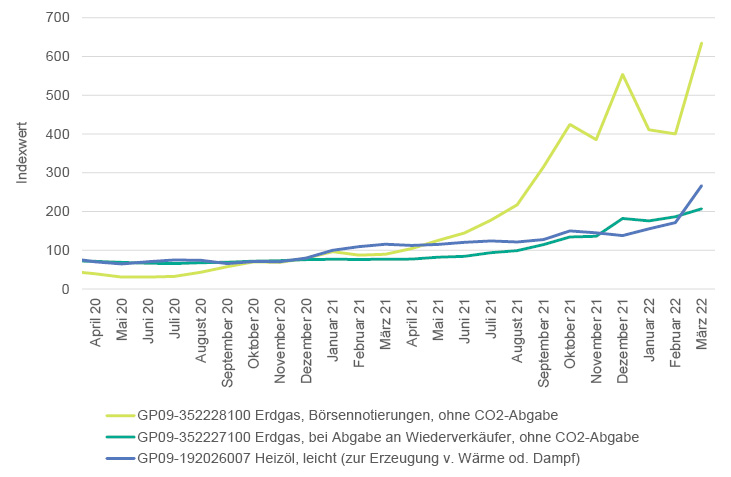 Wie in Abbildung 1 dargestellt, steigen seit Mitte 2021 die Brennstoffkosten von Energieversorgungsunternehmen sprunghaft an. Der extreme Preisanstieg der Terminmarktpreise spiegelt sich auch anhand der stark gestiegenen Indexwerte des Statistischen Bundesamtes wider (siehe Abbildung 1). Der Erzeugerpreisindex Erdgas, Börsennotierungen (GP09-352228100) ist im März 2022 im Vergleich zum Vorjahresmonat um das 6-fache angestiegen. Auch der Erzeugerpreisindex Erdgas, bei Abgabe an Wiederverkäufer (GP09-352227100), der von vielen Wärmeversorgern in den Preisgleitklauseln zur Weitergabe der Erdgaskosten an die Fernwärmekunden verwendet wird, ist im März 2022 im Vergleich zum Vorjahresmonat um das 1,7-fache angestiegen. Gleiches gilt für den Erzeugerpreisindex Heizöl, leicht (zur Erzeugung von Wärme oder Dampf, GP09- 192026007), welcher im März 2022 im Vergleich zum Vorjahresmonat den 1,3-fachen Wert angenommen hat.