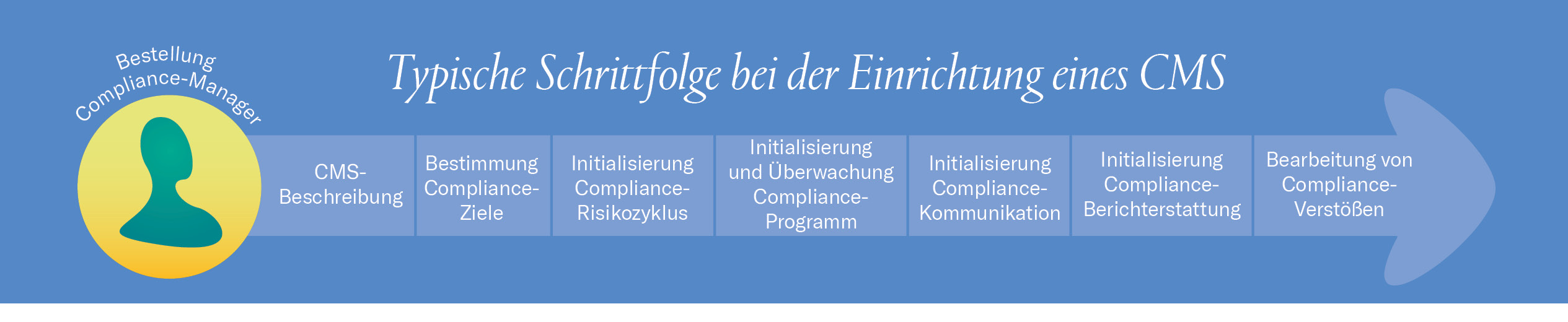 Die unausgesprochene, aber häufig anzutreffende Sorge, dass die Einrichtung eines CMS eine heillos vertrackte Angelegenheit sein wird, ist unbegründet. Bei der ersten Bestandsaufnahme zeigt sich oft, dass schon gute Grundlagen vorhanden sind, auch wenn die dezidierte Zusammenführung in einem Dokument, einer CMS-Beschreibung, vielleicht noch nicht erfolgt ist. Als sinnvoll erweist sich die Empfehlung, frühzeitig eine organisatorische Verantwortung für Compliance zu bestimmen, also beispielsweise einen Compliance-Verantwortlichen oder -Beauftragten. Ab diesem Zeitpunkt kann die Geschäftsführung aus der eigenen operativen Compliance-Tätigkeit hinüberwechseln in die Rolle desjenigen, der das System überwacht und die Richtungsentscheidungen trifft.