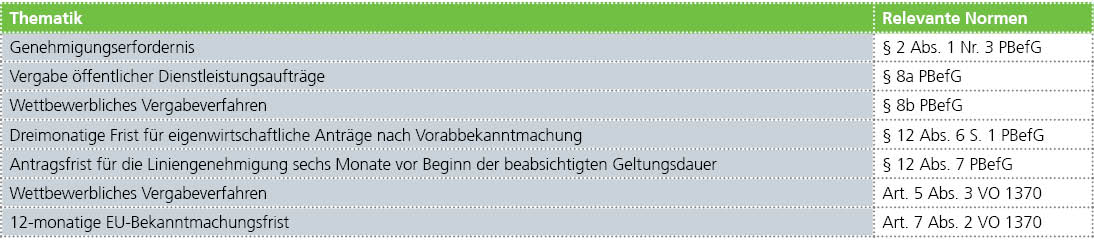 Zur Aufnahme des Betriebs und zur Erbringung der im öffentlichen Dienstleistungsauftrag festgelegten Dienstleistungen benötigt der Gewinner des wettbewerblichen Vergabeverfahrens eine personenbeförderungsrechtliche Linienverkehrsgenehmigung (§ 2 Abs. 1 Nr. 3 PBefG). Den dafür erforderlichen Antrag hat der Gewinner nach § 12 Abs. 7 PBefG spätestens sechs Monate vor dem Beginn der beantragten Geltungsdauer bei der Genehmigungsbehörde zu stellen, wobei diese Frist auf Antrag verkürzt werden kann.