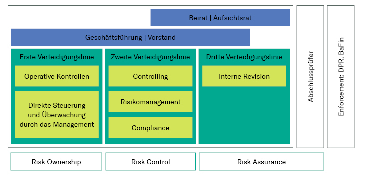 Die Verantwortung liegt zunächst bei den Mitarbeitern in der ersten Verteidigungslinie, die neben dem Aufbau operativer Kontrollen auch eigene Kontrollen durchführen und Steuerungsmechanismen etablieren müssen. Mit zunehmender Unternehmensgröße richtet die Unternehmensleitung ein Controlling, ein Risikomanagement und eine Compliance-Abteilung ein. Die interne Revision ist Kern der dritten Verteidigungslinie und sollte Risiken aufdecken, wenn die vorgelagerten Systeme sie nicht verhindern konnten. Der Abschlussprüfer ist nicht Bestandteil des internen Kontrollsystems. Das interne Kontrollsystem hat versagt, wenn der Abschluss­prüfer bis dato nicht bekannte Risiken aufdeckt.