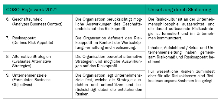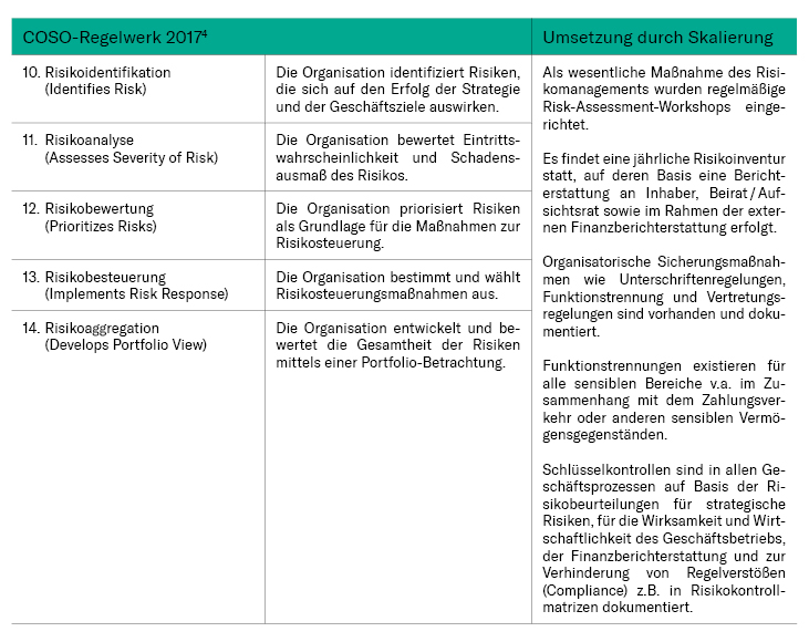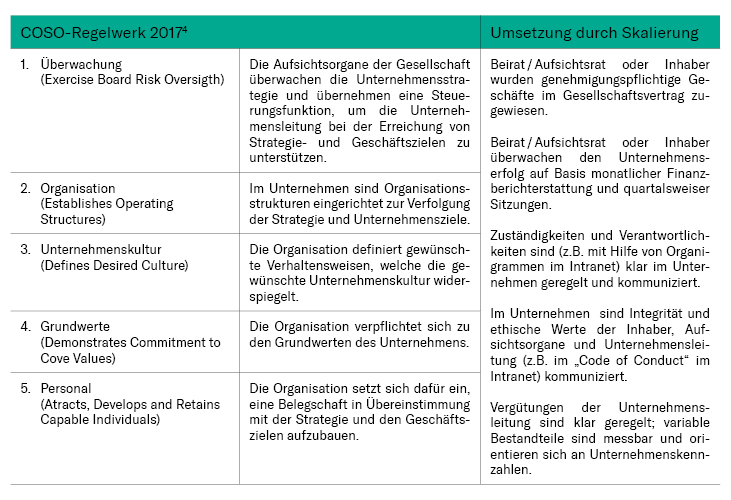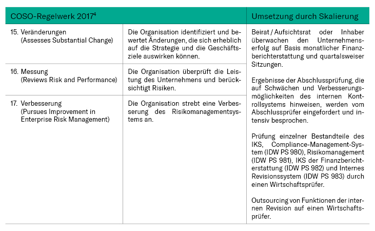 Die optimale Ausgestaltung des internen Kontrollsystems mittelständischer Unternehmen wird nicht nur wegen des Aufwands, der bei der Implementierung entsteht, durch die individuellen Ressourcen und organi­sato­ri­schen Voraussetzungen begrenzt. Deshalb sind die konzeptionellen Anforderungen angemessen auszu­gestalten – zu skalieren – und nicht sämtliche zur Verfügung stehenden Instrumente ausgefeilt zu struk­turieren.