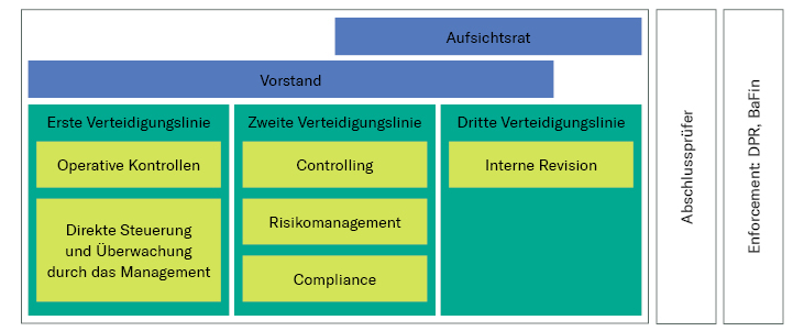 Die verschiedenen Rollen des Managements und die Maßnahmen des Risikomanagements, der Steuerung und Überwachung können sehr anschaulich mit Hilfe des Three-Lines-Defense-Modell dargestellt werden. Das Modell wurde im Januar 2013 im Positionspapier „The three lines of defense in effective risk management and control“ [1] des Institute of Internal Auditors (IIA) publiziert. In dem im Juni 2019 begonnenen Exposure Projekts [2] erarbeitet das IIA Vorschläge zur Erweiterung und Verbesserung des Modells.
