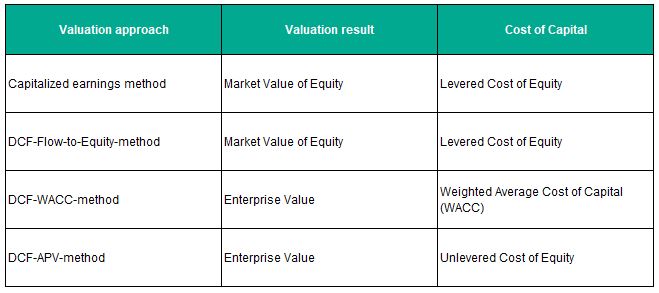 The valuation method used determines the derivation of the cost of capital. The cost of capital for each valuation approach is as follows: