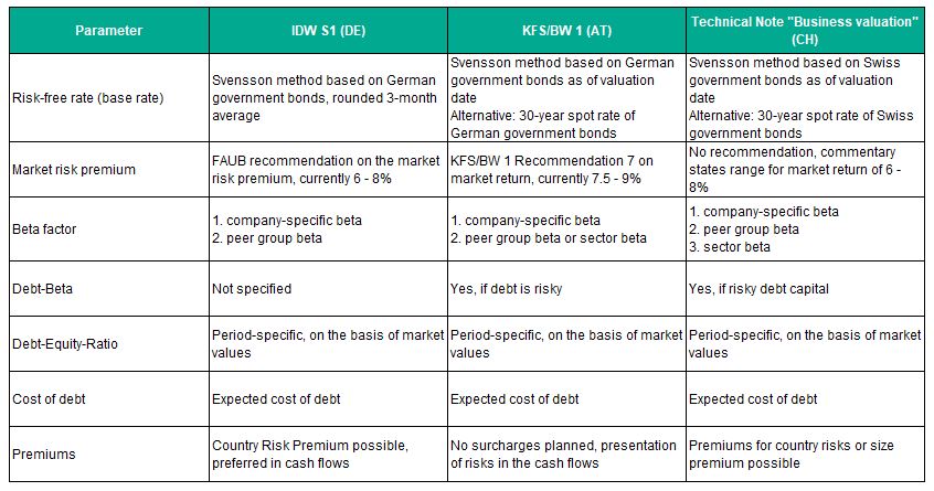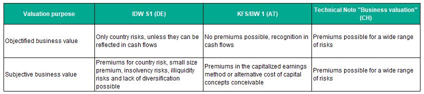 The methods listed in the table are permitted in all three countries. While the capitalized earnings method is widely used in Germany, a preference for the DCF-WACC method is emerging in Switzerland.