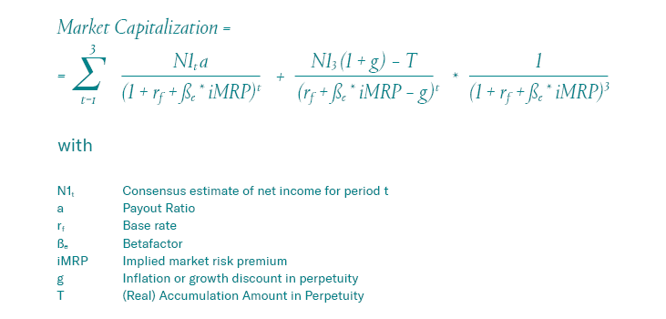 The iMRP is based on average analyst estimates ("consensus estimates") of future earnings (net income) for publicly traded companies. Forecast periods of three years are generally used, as estimates beyond this time horizon generally do not provide sufficient coverage. Analysts' earnings forecasts (including payout ratios, where applicable) are used as the numerator in the valuation equation. The denominator of the valuation equation is filled with the cost of capital parameters of the base rate, beta factor, and growth discount. The base interest rate can be measured at the balance sheet date using the Svensson yield curve. The beta factor of the individual companies analysed can also be measured or is set to 1.0 as part of an overall market analysis. Appropriate assumptions are made regarding the inflation and growth discount. The valuation result is given and corresponds to the market capitalisation (equity value) on the valuation date.