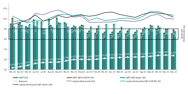 FAUB justifies its recommendation on the range of market risk premiums to be used for company valuations with a pluralistic approach. In addition to a historical view, it also provides for a forward-looking analysis. The latter is done by determining the implied market risk premium (iMRP) based on analyst estimates.