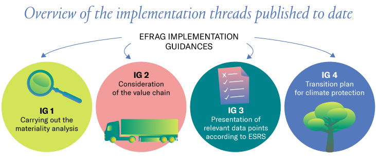 As part of the European Sustainability Reporting Standards (ESRS), the European Financial Reporting Advisory Group (EFRAG), as an advisory body and developer of the ESRS, has been commissioned by the European Commission to produce Implementation Guidance (IG). These implementation guidelines are intended to provide companies with targeted and timely support in preparing a CSRD-compliant sustainability report. However, the guidelines are explicitly non-binding support.​