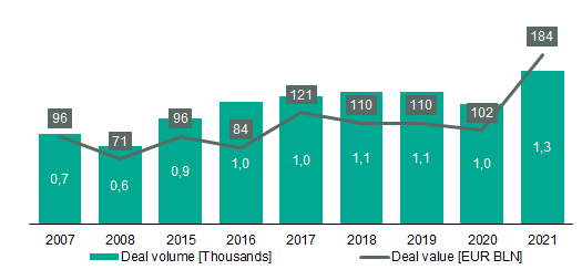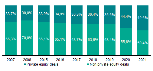 Previously unpopular sectors became attractive targets, especially for private equity houses, following changing consumer demand and arising growth opportunities. CVC’s majority stake acquisition of Medivet, a UK based veterinary group, for more than USD 1bn, is only one of many examples. Numerous private equity houses have further stretched their usual holding periods partly due to COVID-19 and hence are now in the need to re-shuffle their portfolios. Timing for that is not bad as valuations are at a peak. As a result, private equity involvement increased, especially over the last two years accounting for every second transaction in 2021.