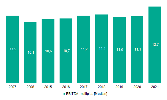 Global M&A activity in 2021 hit a record in terms of both, deal volume and value. While at the beginning of 2020, COVID-19 threatened a collapse of the global economy, people and corporations adapted quickly to the new normal and economies recovered swiftly supported by enormous governmental stimulus packages. Likewise, after a temporary pause in H1 2020, global M&A activity revived during H2 2020 and the tailwind continued in 2021. Notably, the average deal value accelerated in 2021 driven by investor confidence based on solid economic growth, easy access to capital and dry powder at private equity houses. As a result, valuations based on EBITDA transaction multiples peaked in 2021.