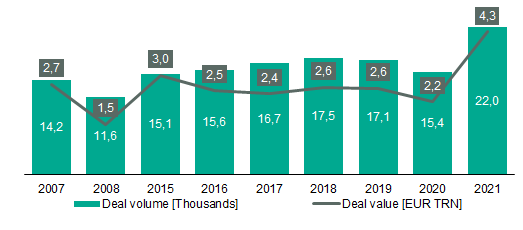 The German M&A market essentially mirrors the global trend of deal volume and value. Notably, deal value increased at a much higher rate in Germany compared to global levels which is multifold but presumably due to economic and political stability as well as a strong R&D footprint. The two largest announced German transactions in 2021 were the takeover of Deutsche Wohnen by Vonovia forming the largest real estate company in Germany for a transaction value of USD 19bn and the acquisition of the German based automotive lightning and electronic specialist Hella by French based Faurecia for a consideration of USD 8bn. A similar trend is also observable in the German mid-cap market, globally known for its hidden champions, which particularly attracted private equity players.