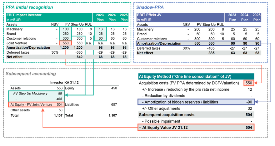 The difficulty in post-acquisition recognition arises from the last point above – amortisation of the recognised hidden reserves and liabilities of the joint venture. This is because of the necessity to not only carry out the actual PPA to enable the initial recognition but also to perform a so-called “shadow PPA” for the proportionately acquired identifiable assets and assumed liabilities of the joint venture.