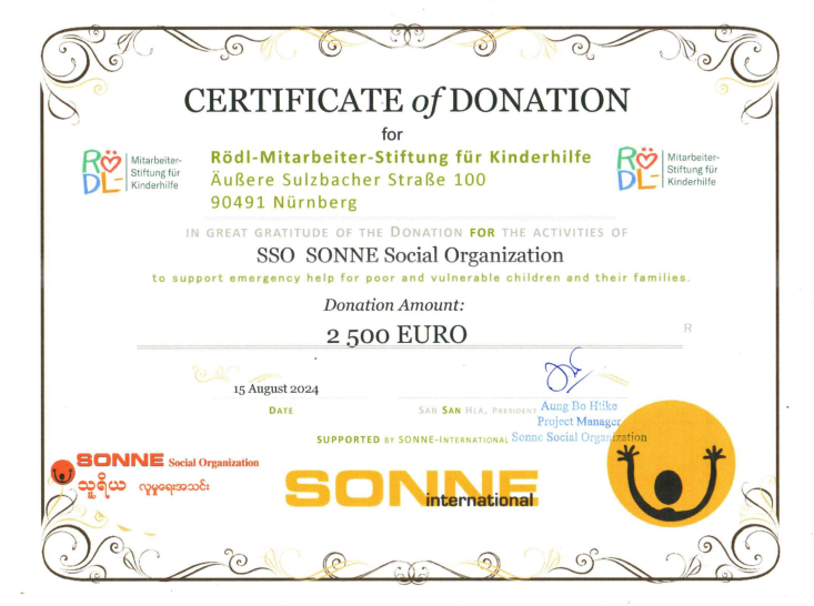 The team of the Sonne Social Organization (SSO) – with Jochen Meissner as our contact person – has whole­heartedly thanked us and everyone involved. With our contribution, we were able to achieve a lot for many innocent people in need in Myanmar.