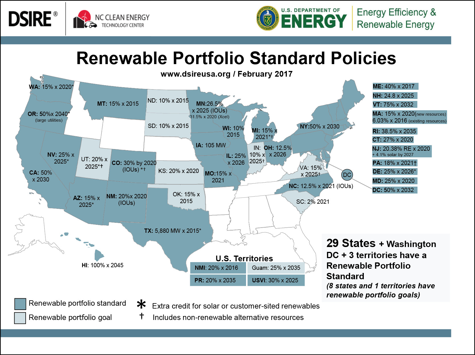 The U.S. states have far-reaching powers in terms of deciding which energy sources to incentivize. In adopting the so-called Renewable Portfolio Standard Policies, a large number of U.S. states committed to supplying a certain share of their electricity from renewable resources by a certain date or year. The graph released in February 2017, i.e. after Donald Trump's inauguration, shows that 29 U.S. states, Washington D.C. and 3 U.S. territories implemented the Renewable Portfolio Standard Policies. Another 8 U.S. states and one U.S. territory have at least set themselves voluntary Renewable Portfolio Goals.