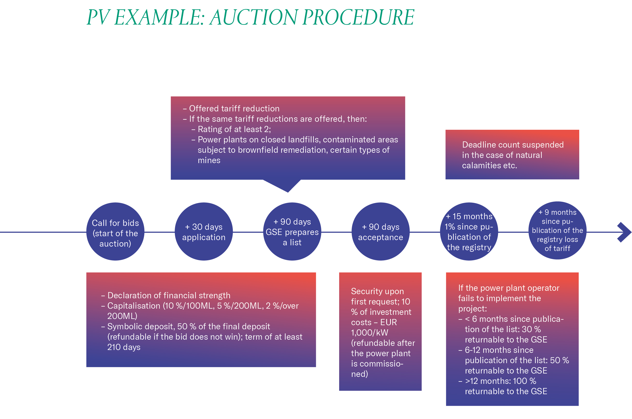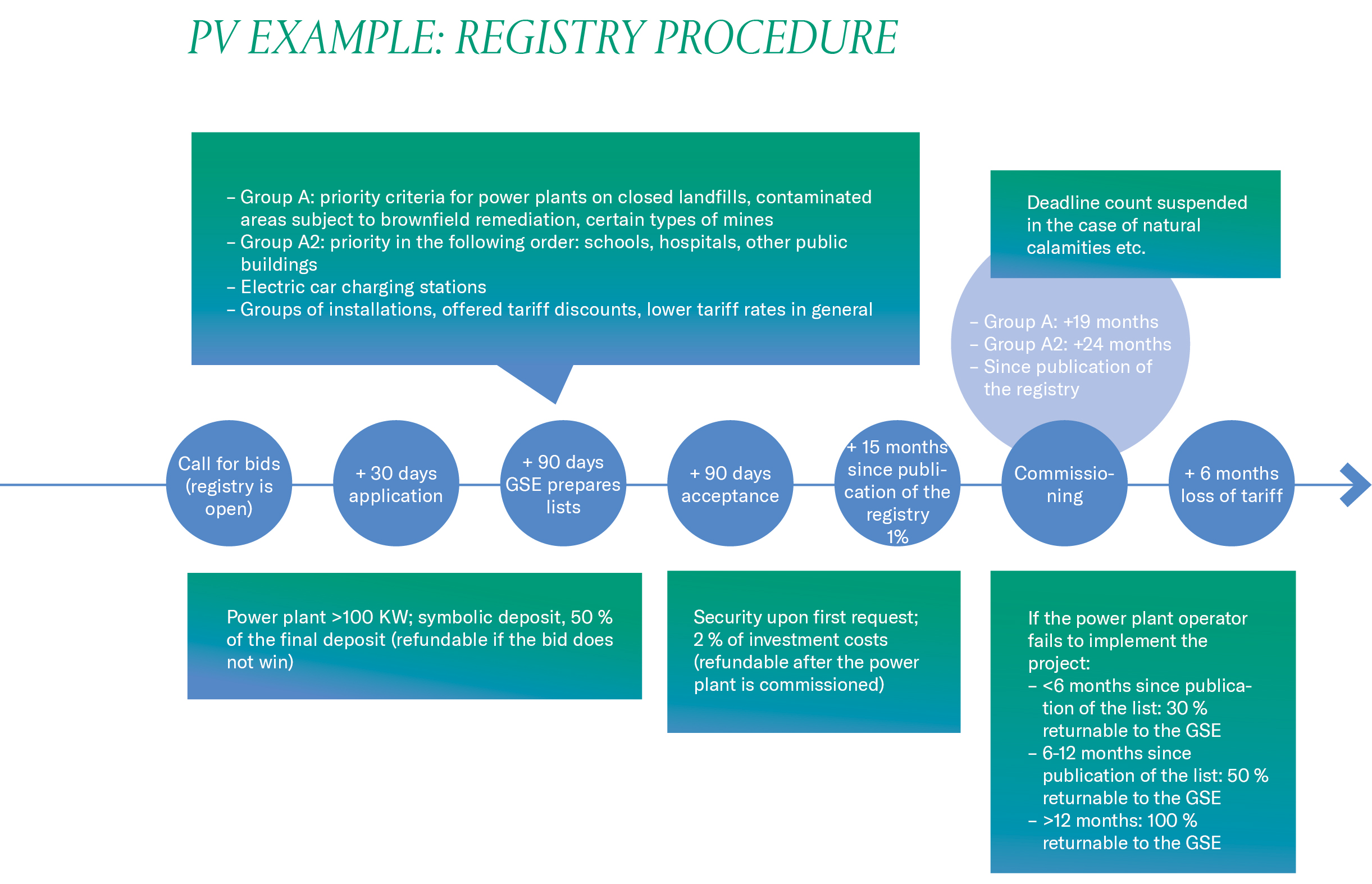 The draft of the decree provides for two different routes for obtaining incentives. For power plants with a capacity of less than 1 MW, incentives are granted after enrolment in a special registry, while power plants with a capacity of over 1 MW will be subject to the auction regime.