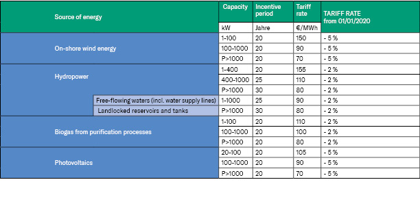 Power plants to be commissioned within one year of the effective date of the decree are subject to the tariffs specified in the FER 2016 Decree. This does not include photovoltaics, for which no tariffs are provided for under the FER 2016 Decree.