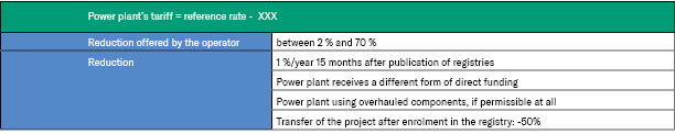 In the case of enrolled power plants, the expected tariff rate will depend on the reference rate of the tariff subject to a percentage deduction where possible.