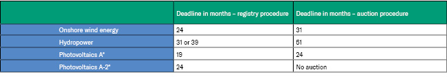 As regards the commissioning of power plants with contracts awarded as part of the registry or auction procedure, the following deadlines apply:
