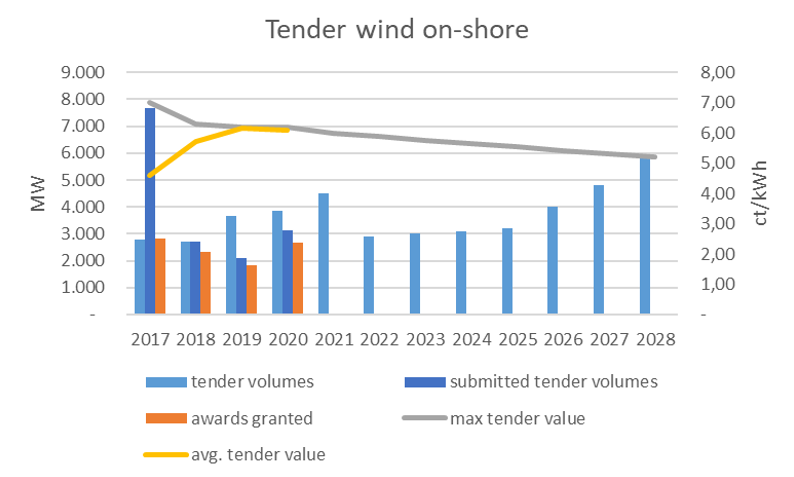 After a relatively large number of tender rounds were held per year in the last two years, the number will now be reduced to three per year. The tender volumes - distributed proportionally over these dates - will be reduced by 1,600 MW in 2022 compared to 2021. Further, they will increase only slightly by 100 MW per year until 2025, then more strongly by 800-1000 MW per year until 2028. The target is an installed capacity of 71 GW in 2030 (§ 4 No. 1 EEG 2021). At the end of November 2020, onshore wind turbines with a capacity of 54.2 GW were connected to the grid.