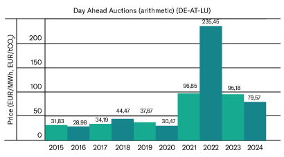 In 2024, average exchange electricity prices (day-ahead auctions) fell by around 16 percent year-on-year to €79.37/MWh. Compared to the energy crisis year 2022, the decline was as much as around 66 percent​​​​ and compared to 2021, a decline of around 18 percent was recorded. This was despite the fact that import volumes peaked in 2024.