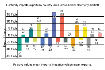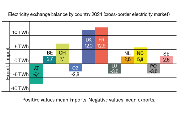 In Europe, electricity is traded across borders, which means that it is produced where generation costs are lowest. This promotes efficient trading and the utilisation of cost-effective energy sources across national borders. Electricity imports and exports are therefore unrelated to security of supply.