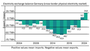 The electricity import surplus of around 28 TWh in 2024 has caused a great deal of public debate, although this only accounts for a marginal 6 percent​​ of total electricity consumption in Germany (around 646 TWh). The import and export of electricity between Germany and its neighbouring countries is a common process that has always taken place in all directions. The focus is on creating a cost-efficient cross-border electricity market from which all participating countries benefit. The import surplus therefore provides no indication of Germany's security of supply, which has never been jeopardised.​