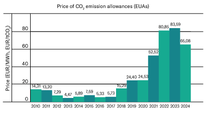 The European Emissions Trading System (EU ETS 1) covers all large energy industry plants and other energy-intensive industry plants across Europe. It is a Europe-wide trading system for emission allowances that enables the companies that own them to emit emissions. The aim of the system is to create economic incentives to reduce emissions. Since 2018, there has been a significant rise in prices on this market, making electricity production with conventional power plants increasingly unattractive. Prices are expected to rise further in future due to the decreasing number of available emission allowances.