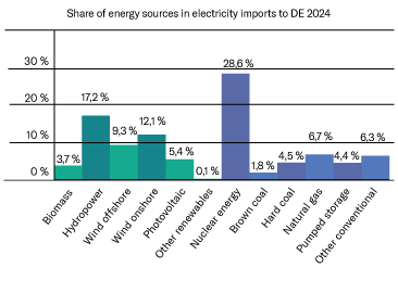 Figure 3 shows the share of energy sources in German electricity imports. In 2024, the share of renewable energies in the electricity mix of the import volume was around 48 percent, followed by energy generation from nuclear power at around 28 percent.