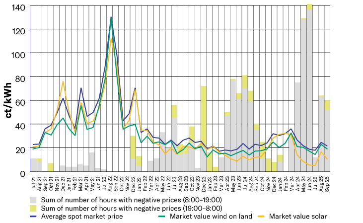 The historic lows in the market value of solar power are directly attributable to an oversupply of electricity at certain times of the day. In this context, new highs in the number of hours with negative electricity prices were recorded in May and June 2025: 129 and 141 hours, respectively. By the end of September, the number of hours with negative electricity prices in the current year had risen to 525. In the same period last year, the number was 413 hours.8